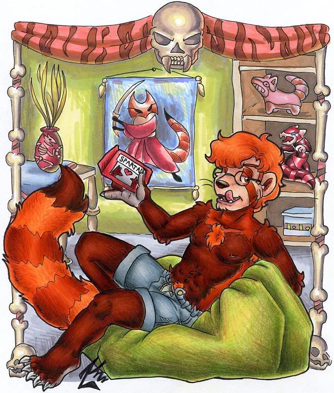 Mature rating for unzipped shorts (but nothing showing) and waving a box of condoms. If anyone remembers my red panda Tobias, this is his father when he was younger. They look a lot alike, but there's some physical differences.