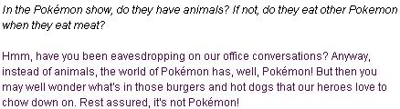 Seeing how common things in modern life are transformed into Pokemon (Crows-Murkrow, Raccoons-Zigzagoon, Butterfly-Butterfree, Pidgeon-Pidgey, etc), I guess meat would be Pokemon too right? (Perhaps Miltank and Tauros would be beef). But from Wailord's Wikipedia page it talks about the existence of krail. And Sneasel's page shows that it eats eggs (Could be Pokemon eggs, but we never know). I just wanted to put this up since noone mentioned it yet, and I bet lots of you had this come to mind at once.
