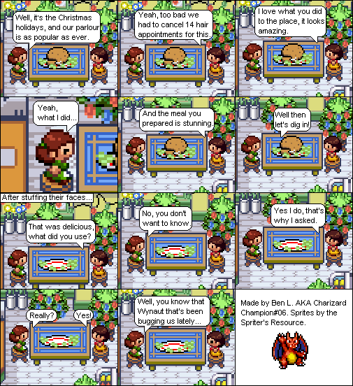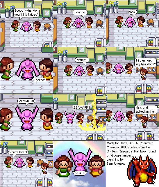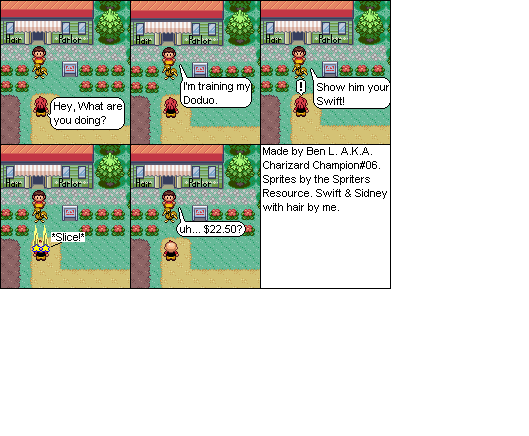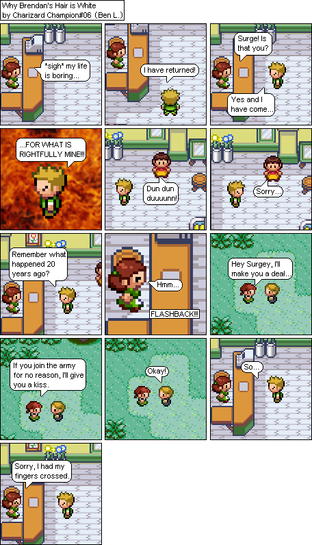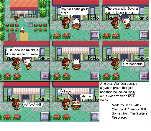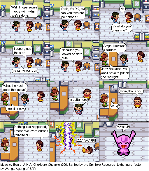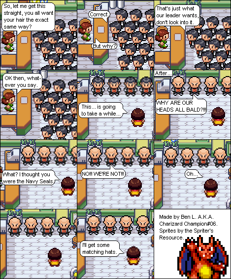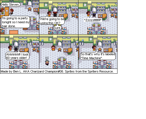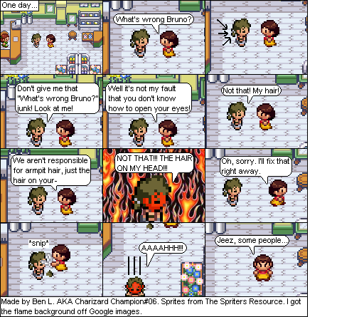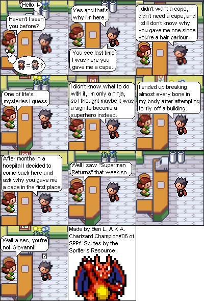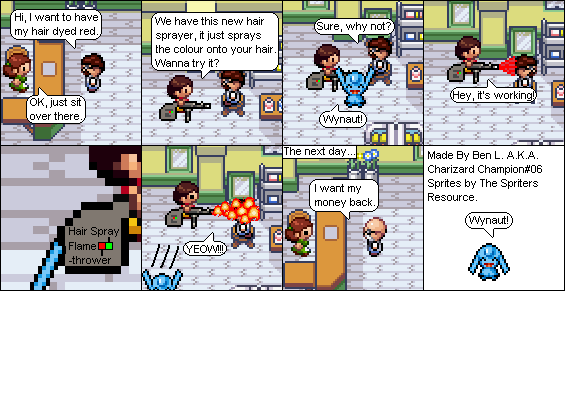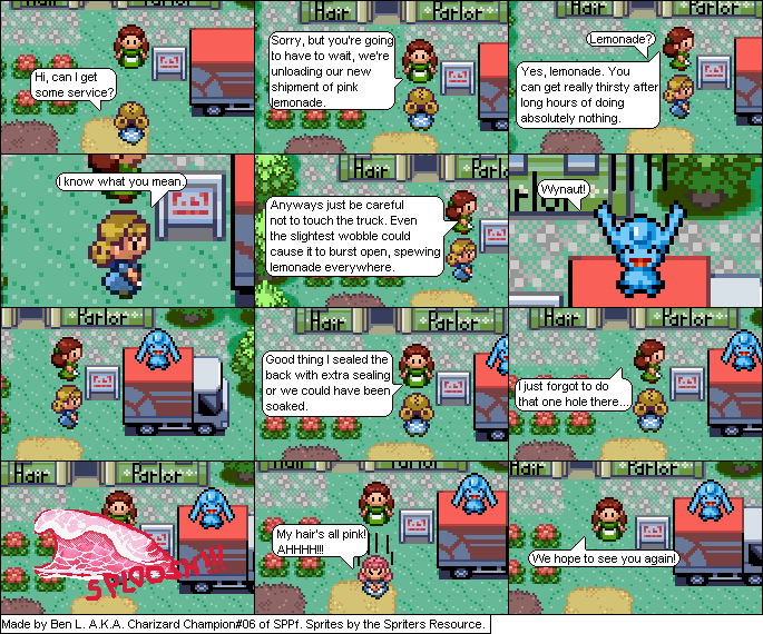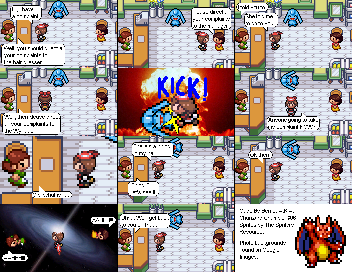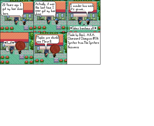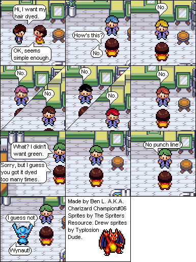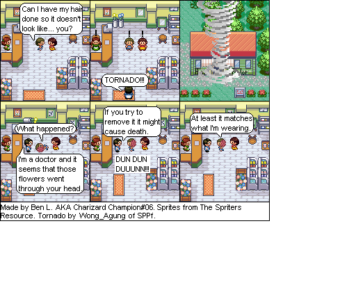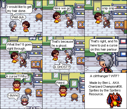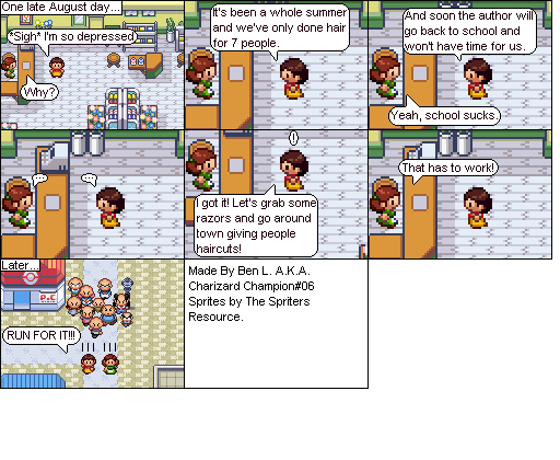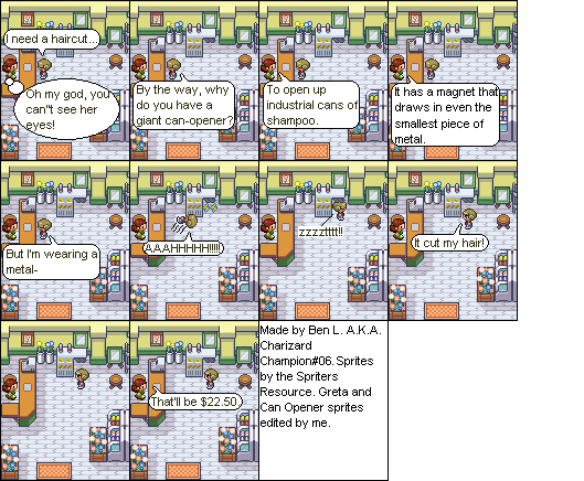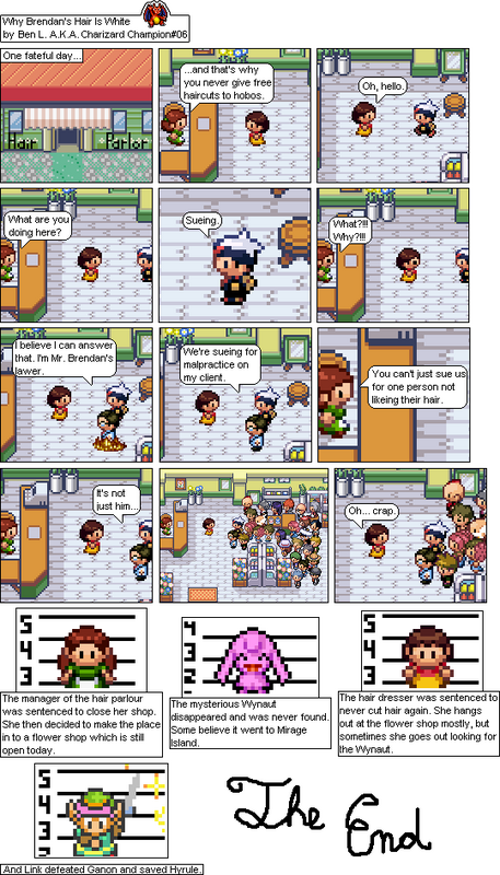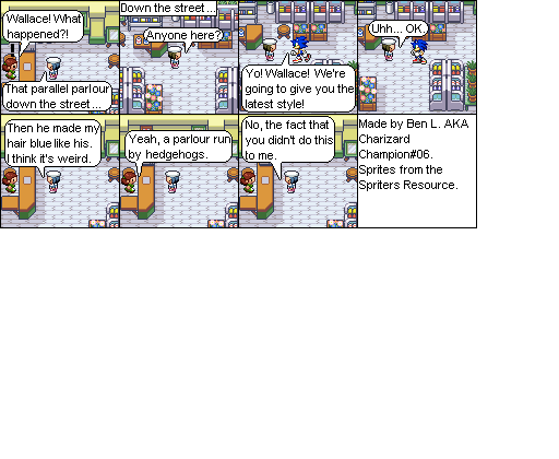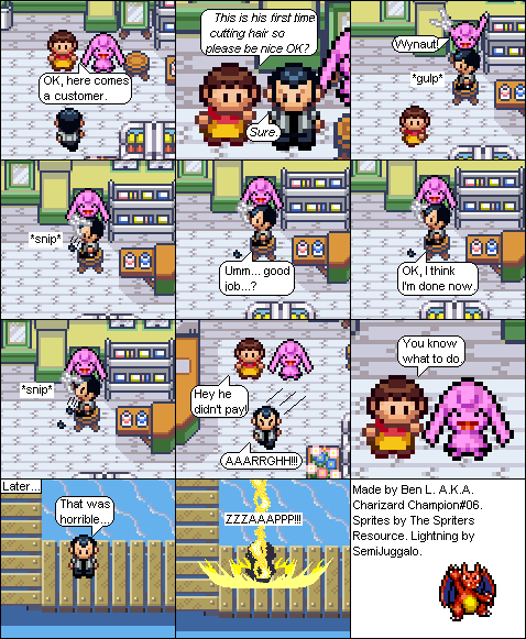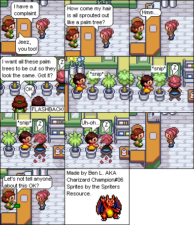 Basically this is a comic about a hair parlour in hoenn where characters from the Pokemon series come in and get there hair done... badly... and it shows how each character got their hair that way. Enjoy!